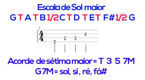O Acorde sétima maior é formado pela tônica, terça maior, quinta justa e sétima maior.