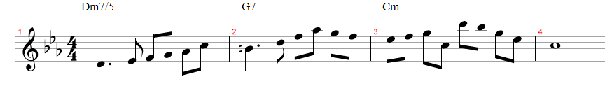 Agora, utilizando a sequência de acordes, vou utilizar algumas notas guias e criar um solo sobre esses acordes, nos acordes de Dm7(b5) e G7, escala menor harmônica, e no acorde de Cm, a escala menor natural:
